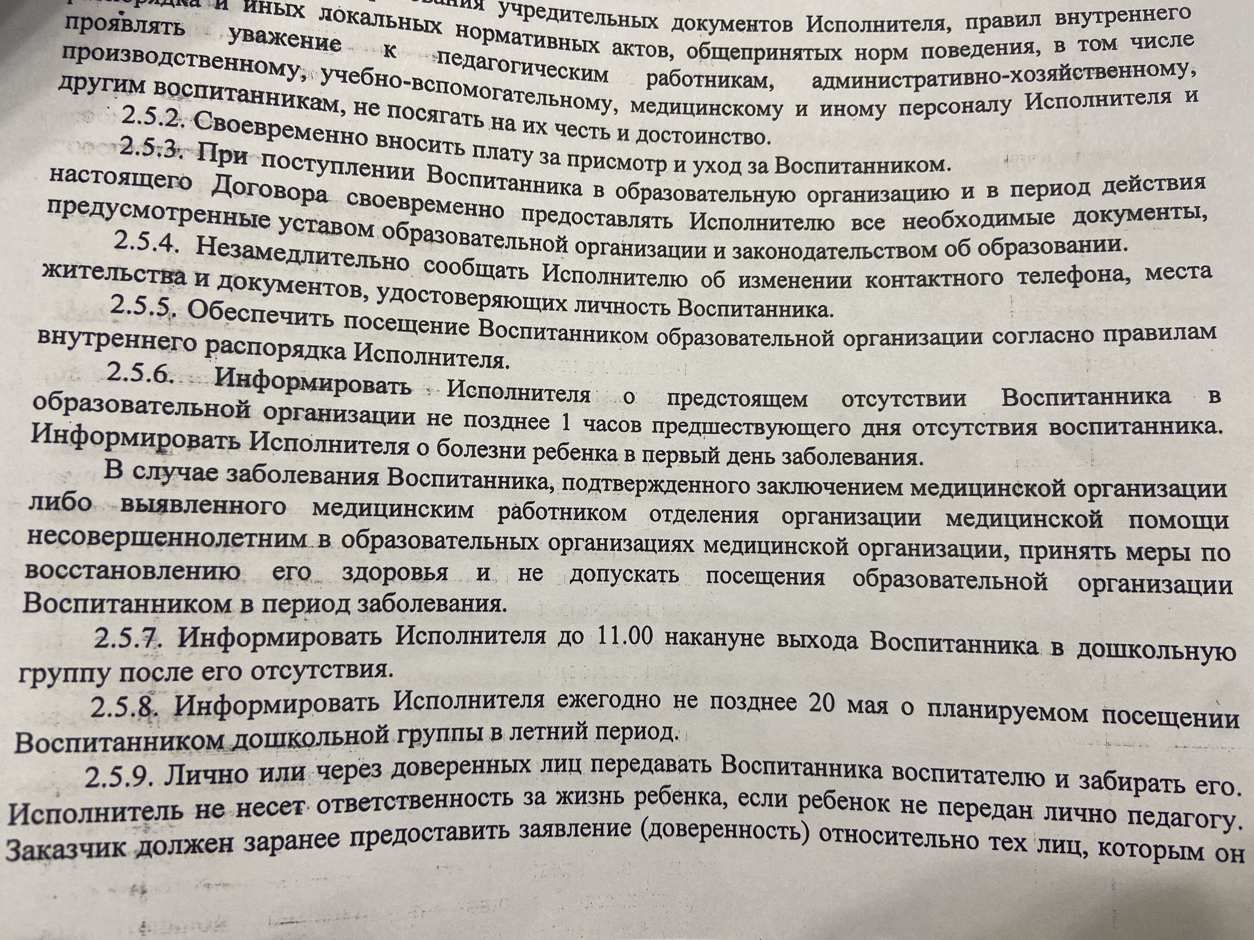 В соответствии с п.1 Дополнительного соглашения к Договору об образовании по образовательным программам дошкольного образования от 27.12.2022г., «уважительными причинами непосещения воспитанниками образовательной организации является: отсутствие воспитанника по причине кратковременного недомогания, заболевания или семейным обстоятельствам, но не более 5-и (пяти) рабочих дней в месяц, а также летние месяцы (с июня по август), подтвержденные информацией за подписью родителя (законного представителя)»