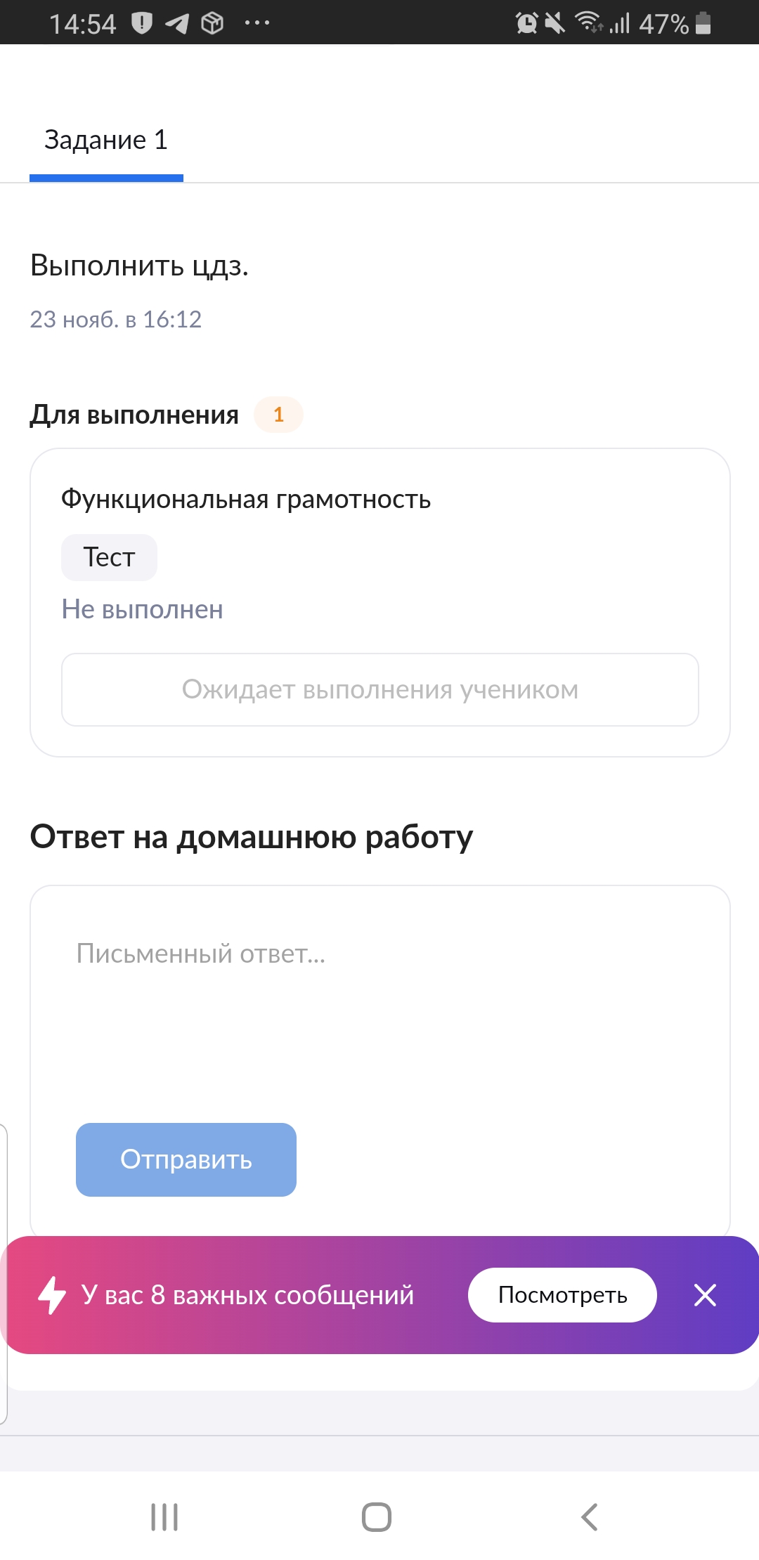Задания для самостоятельной работы в формате теста с автоматической проверкой выполняются только из личного кабинета обучающегося. Каждый родитель может проверить выполнения ЦДЗ через личный кабинет ребенка.