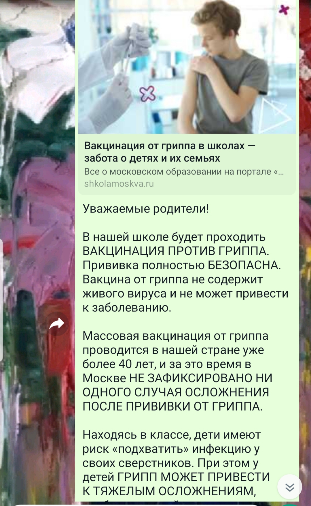 Уважаемая Ирина Вячеславовна! Вакцинация против гриппа входит в региональный и национальный календарь профилактических прививок и проводится ежегодно (раз в год) до наступления эпидемиологического сезона. Ваши педагоги, также как все граждане страны, руководствуются Федеральными законами № 323-ФЗ от 21.11.211 г. «Об основах охраны здоровья граждан В РФ» (ст.20) и № 157-ФЗ от 17.09.1988 г. «Об иммунопрофилактике инфекционных болезней» (ст.5), проявляют постоянную заботу о детях, хорошо понимают, что они находятся в больших группах (классах) и поэтому в значительной степени подвержены риску заболевания гриппом. Очень важно в целях предотвращения заболевания сделать прививку, так как вакцинация является единственной действительно эффективной защитой от гриппа и его осложнений. Медицинский персонал поликлиник образовательных организаций совместно с классными руководителями ведут разъяснительную и информационную работу.
