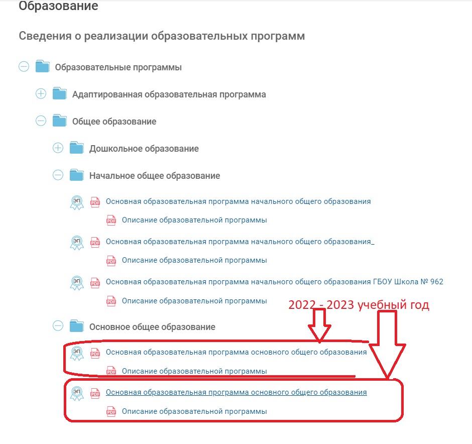 Уважаемые родители! В разделе «Сведения о реализации образовательных программ» действительно была ошибочно размещена продублированная информация об основной образовательной программе основного общего образования на 2022-2023 учебный год. В настоящее время данный недостаток устранен. На сайте размещена актуальная версия основной образовательной программы. Администрация ГБОУ Школа №962 выражает Вам искреннюю благодарность за неравнодушное отношение к проблемам школы и надеется на дальнейшее сотрудничество.